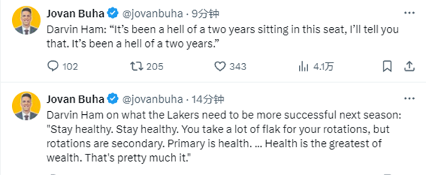 赛后谈到湖人首轮出局以及下赛季,哈姆表示:保持健康,保持健康。你因为轮换方式遭到了很多批评,但轮换是次要的。健康是首要的。健康是最大的财富。差不多就是这样。