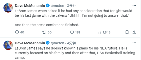 虽然里奇-保罗表示詹姆斯可能会再打2-3年,名记曝詹姆斯新赛季会继续为湖人效力,但詹姆斯本人拒绝回答自己的NBA计划,拒绝回答今天是不是湖人谢幕战。