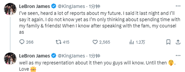 对于外界的一系列猜测,詹姆斯发推回应:我看到、听到了很多关于我未来的报道。我昨晚说过,现在我还会再说一遍。我还不知道,因为我只想着和家人朋友们共度时光!当我和家人、我的顾问以及我的经纪人谈过这个之后,我才会知道,届时你们也会知道。爱你们(王冠表情)