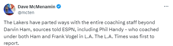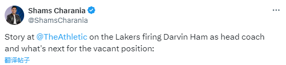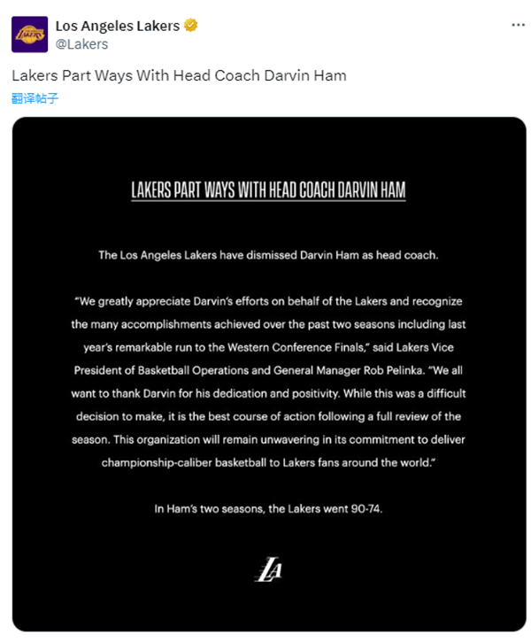 湖人官方正式宣布,球队已经和主教练哈姆分道扬镳,湖人GM佩林卡发表声明:“我们非常感谢哈姆为湖人付出的努力,并认可他在过去两个赛季里取得的许多成就,包括上赛季打进西部决赛。我们都要感谢哈姆的奉献和积极性。虽然这是一个艰难的决定,但在对整个赛季进行全面评估后,这是最好的选择。这支球队将坚定不移地奋力为全世界的湖人球迷继续带来冠军级别的篮球比赛。