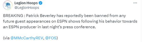 即使道歉也没用,据FOS记者Michael McCarthy报道,ESPN已经决定封杀贝弗利,将不会再请他做节目,例如《First Take》《Get up》等。