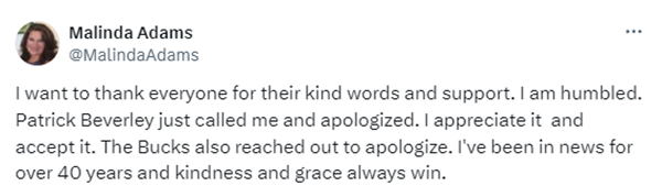 ESPN女记者Malinda Adams发推透露:我想感谢大家的善意言辞和支持,我很感激。帕特里克-贝弗利刚刚给我打电话道过歉了,我接受了,雄鹿队也联系我表达了歉意。我在新闻届已工作40多年,我始终相信善良和优雅会赢得一切。