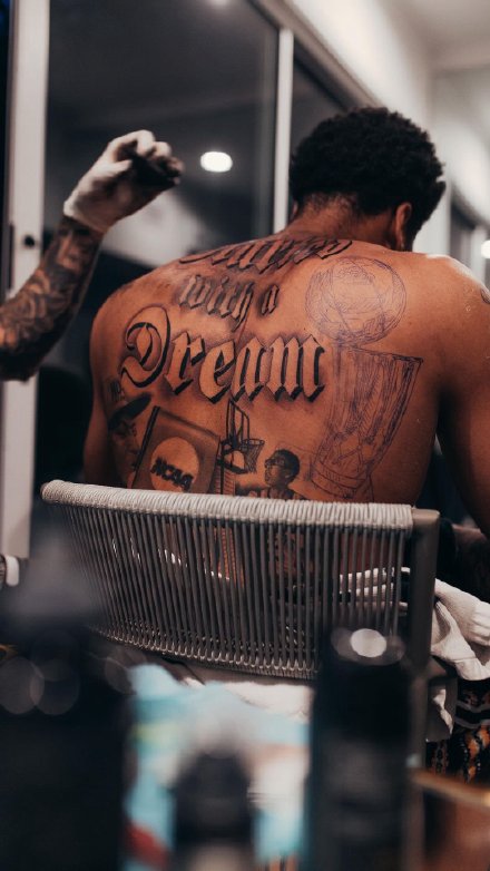 178直播讯 北京时间5月5日,湖人球星安东尼-戴维斯在背部新增了多处纹身,纹上自己身穿肯塔基大学23号球衣的画面,还纹上2012年NCAA冠军奖杯和湖人2020年总冠军奖杯,后背上还纹着“始于一个梦想”的字样。