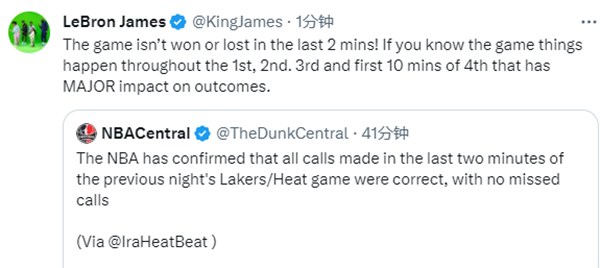 詹姆斯正式回应湖人和热火最后2分钟零误判,发推写道:比赛胜负不是由最后两分钟所决定的!如果你了解比赛,你就知道在第一节、第二节、第三节和第四节前10分钟内所发生的事情对最终赛果有重大的影响。
