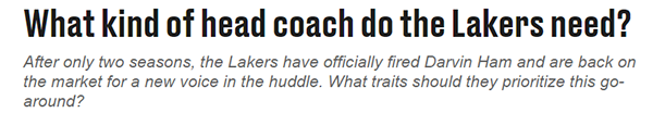 湖人该选一名什么样的新帅呢?湖人美媒《silverscreenandrol》撰文表示,哈姆因执教能力(比如球员轮换、临场反应等)不足、缺乏自我问责等原因被解雇,因此湖人需要寻找一个具备特定素质的人:赢得球员的尊重,尤其是球星们的尊重,优化轮换,有更好的暂停和挑战管理,也许最重要的是,即使没有过错,也要追究自己的责任;除此之外,湖人管理层需要找到一名能够点燃球队且适合球队的新帅。