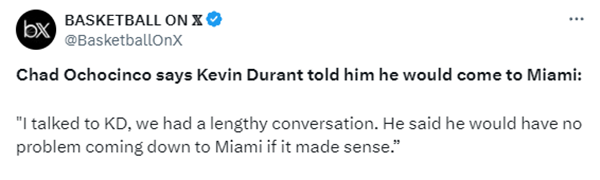 178直播讯 北京时间5月8日,太阳三巨头真要解体吗?据报道,杜兰特愿意加盟迈阿密热火;查德-奥乔辛科透露,杜兰特告诉他他愿意来迈阿密,直言: 我和 KD 谈过了,我们进行了长时间的交谈。他说如果合适,他愿意加盟迈阿密(热火)。