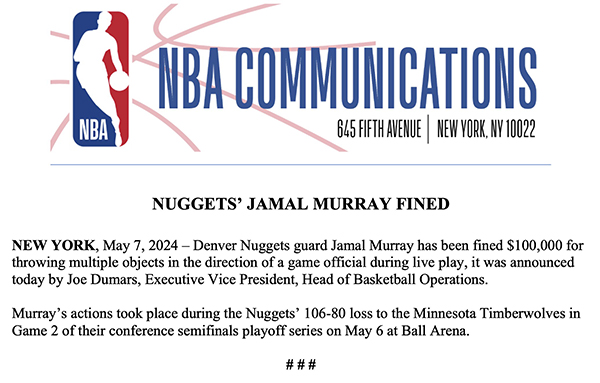 178直播讯 NBA官方重磅罚单,据名记shams报道,掘金球星贾马尔-穆雷因扔毛巾以及向场内仍热敷垫被联盟追加巨额罚款,不会被禁赛;之后NBA官宣穆雷被重罚10万美元。