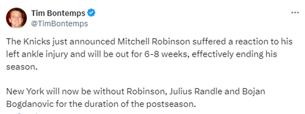 178直播讯 北京时间5月8日,纽约尼克斯官方宣布,米切尔-罗宾逊遭遇左脚踝应力性损伤,他将在6-8周后接受复查,如果按6周来算,米切罗复出时间则是6月19号,这意味着米罗因伤提前赛季报销。
