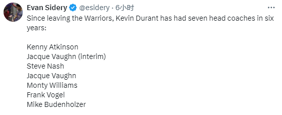布登执教太阳,杜兰特所在球队频频换帅引热议,Evan Sidery表示自从离开勇士后杜兰特已经换了7位主教练——阿特金森、沃恩(临时主帅)、纳什、雅克-沃恩、蒙蒂、沃格尔和布登霍尔泽。