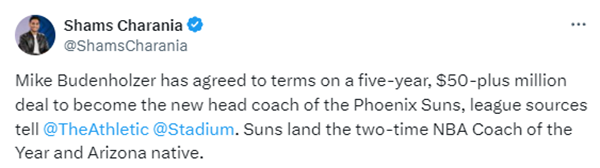 178直播讯 北京时间5月11日,太阳解雇沃格尔后火速敲定新帅,据名记shams报道,太阳已经和布登霍尔泽签下5年超过5000万美元的执教合同,布登成为太阳新任主教练。