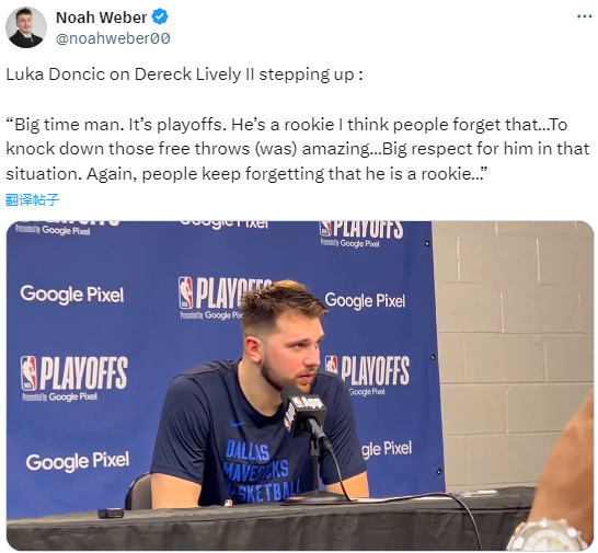 莱夫利G3替补上场27分钟,7投2中、罚球12中8拿到12分8篮板,赛后东契奇夸赞小弟,直言:大人物。这是季后赛。我认为人们忘记了他是个新秀,投进那些罚球真是太棒了,在那种情况下,我非常尊重他。同样,人们总是忘记他是个新秀。