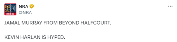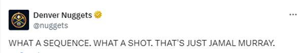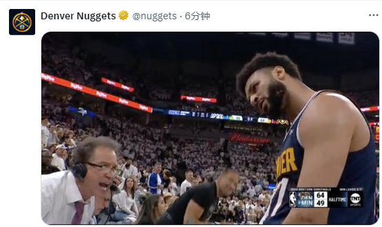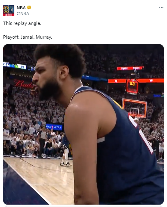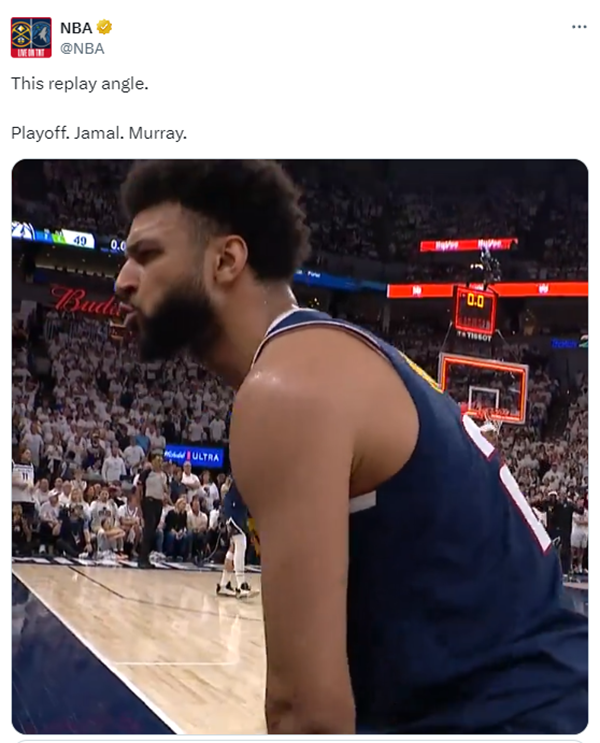 穆雷神奇压哨三分引热议,美媒刷屏狂赞太牛了,NBA官推晒出穆雷进球的另一个角度,配文写道:这就是季后赛穆雷;掘金官方晒穆雷发狠庆祝的画面,还发推写道:多么精彩的抢断,多么精彩的投篮,这就是贾马尔-穆雷。