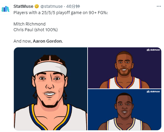 戈登创纪录,据统计,在季后赛中,单场至少25分5板5助且命中率90+%,戈登成为了NBA历史第三人。前两位做到这一点的球员是:里奇蒙德和保罗(2022年对阵鹈鹕14中14)。