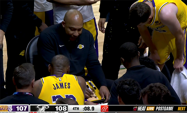从湖人替补席的现场画面可以看出,最后一攻,哈姆布置了一个底角三分战术,詹姆斯坐在替补席,里夫斯弯腰认真听讲,期间哈姆在战术板上画战术,示意让底角的球员绕掩护跑回底角,等着投关键的三分球。