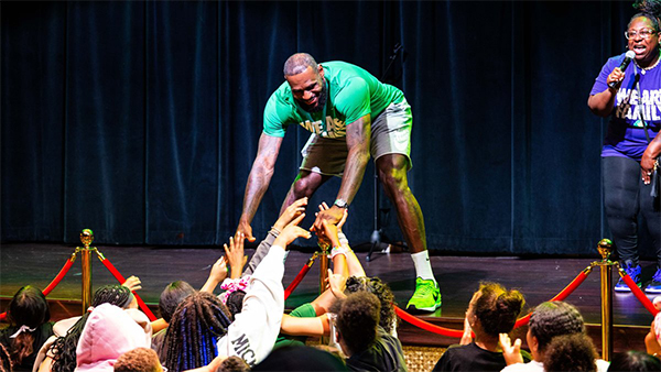 178直播讯 北京时间5月15日,詹姆斯现身自己创办的I Promise”学校,引发全体师生的尖叫欢呼,站在台上弯腰与学生击掌;詹姆斯转发布朗尼言论并且继续鼓励儿子,还鼓励朱莉继续努力打排球。