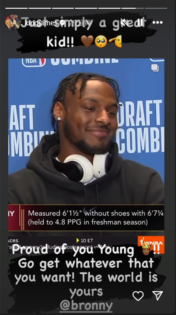 詹姆斯转发布朗尼接受采访的画面,配文写道:很棒的孩子,为你感到骄傲,年轻的王子;去拿你想要的任何东西,全世界都是你的。