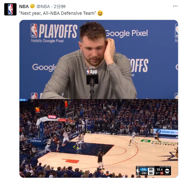 赛后接受场边采访,当有记者提及巴克利在赛前预测雷霆能赢下本场比赛时,东契奇表示:我还不知道这个,但我喜欢他们的节目,我喜欢那四个人,他们会观看所有的比赛。也许我会希望他下场比赛能接着这么预测,然后我们再赢一场。