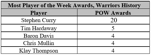 库里创纪录,成为NBA历史上第13位至少获得20次周最佳的球员,继续刷新勇士队史第一纪录,自1979 年 NBA 开始颁发该奖项以来,金州勇士队共 58次每周获奖,其中库里一人获得20次,是勇士队史获得周最佳最多的球员;蒂姆-哈达威5次排在勇士队史第二位,汤普森、穆林和巴郎-戴维斯4次并列队史第三。