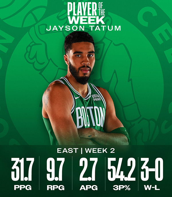 塔图姆本赛季首次当选东部周最佳,生涯第10次当选周最佳,凯尔特人官方第一时间祝贺塔图姆。