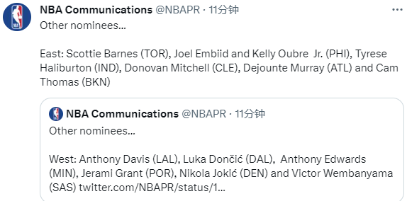 东部:斯科蒂-巴恩斯、恩比德、乌布雷、哈利伯顿、米切尔、德章泰-穆雷、卡梅隆-托马斯