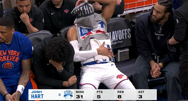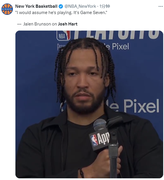 赛后,锡伯杜表示:不知道哈特的具体伤情,我们拭目以待吧;布伦森表示:我猜哈特会打抢七;哈腾表示:哈特愿意为上场做任何事情。只要他腿没断,他就有可能会上场。