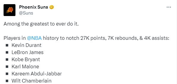 布克和比尔连续伤停,只是苦了35岁的杜兰特;赛季至今,杜兰特一场都没休息,本应该是三巨头带队出战,却变成了杜兰特单核带队,有时候强如死神也是独木难支,频频遭遇里程悲,一度遭遇三连败;上一场杜兰特轰下41分终于带队终结连败,成为历史第6位生涯至少拿到27000分7000篮板4000助攻的球员,另外5位分别是詹姆斯、科比、贾巴尔、卡尔-马龙和张伯伦。