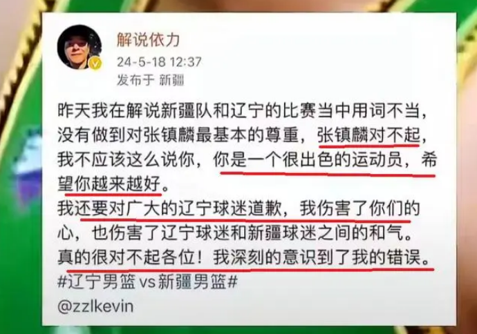 接下来,我们再来说说新疆男篮的解说员依力。在比赛中,当张镇麟出现了一次失误,依力调侃张镇麟这个球是要传给妈妈吗?虽然依力强调了是开玩笑,但是大量的辽宁男篮媒体人在网上集体发声,将目标对准了依力,认为他的调侃侮辱了张镇麟和王芳,要求道歉。