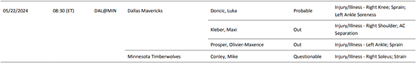 178直播讯 北京时间5月22日,独行侠和森林狼西决G1伤情报告出炉,东契奇(右膝扭伤、左脚踝酸痛)大概率出战,克莱伯(右肩扭伤)和普罗斯珀(左脚踝扭伤)缺席比赛;森林狼老将迈克-康利(右小腿拉伤)出战成疑,50%可能性出战。