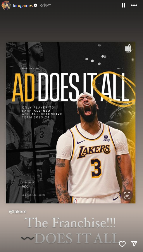 178直播讯 北京时间5月25日,湖人官方祝贺浓眉成为本赛季唯一一位入选最佳阵容和最佳防守阵容的球员,詹姆斯转发海报,并且配文写道:球队顶梁柱!他(浓眉)做到了一切!