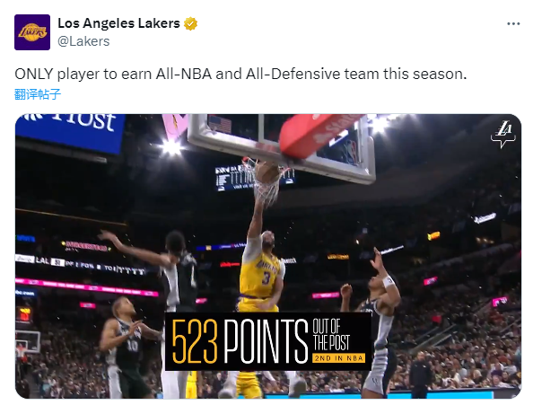 湖人官方还晒出浓眉本赛季的一些关键数据——扣篮拿到523分为联盟第二多,64次两双联盟第三,场均3.5次抢断+盖帽联盟第二,场均12.6个篮板联盟第三且是生涯新高,二次进攻288分联盟第一,出战76场也创生涯新高。