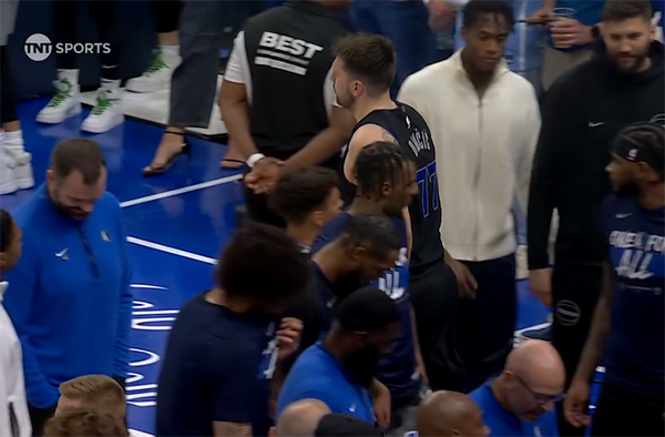 东契奇首节上场8分35秒,5投3中拿到9分2篮板2助攻,期间镜头拍到东契奇忍痛一幕——暂停期间,东契奇明显感觉不舒服,嘴里咬着毛巾而且弯腰扶着膝盖,面露难色。