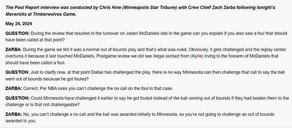 当时,裁判原先对此球的判罚是欧文出界,独行侠随后发起挑战,回放中心确认这一出界球是麦克丹尼尔斯最后接触,宣布挑战成功,把球权还给独行侠。报告指出,当挑战的是界外球时,个人犯规不属于可以审查的项目。
