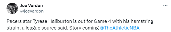 178直播讯 北京时间5月28日,东决G4开打之前,名记woj报道哈利伯顿大概率缺席,之后据NBA记者Joe Vardon报道,步行者球星泰瑞斯-哈利伯顿因腿筋拉伤将缺席东决第四场比赛。