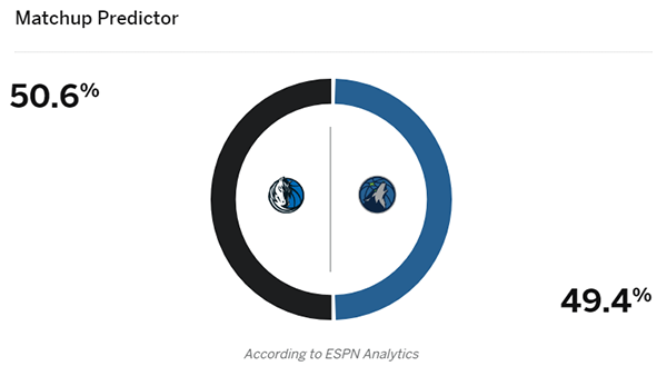根据赛程,独行侠和森林狼G5将在明天上午8点30分开打,ESPN预测本场比赛的胜率:独行侠50.6%,森林狼49.4%,独行侠略占上风,究竟独行侠明天晋级总决赛还是森林狼捍卫主场?拭目以待吧。