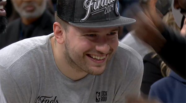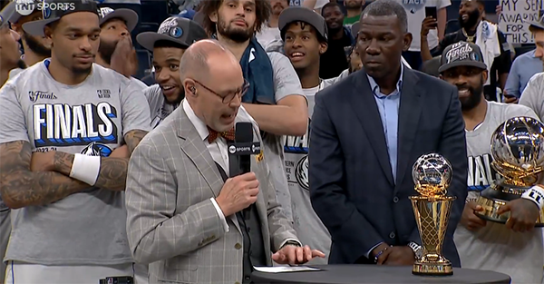 在西部冠军颁奖仪式上,东契奇生涯首次夺得西部冠军,而且全票荣膺西决MVP荣获魔术师约翰逊奖杯,东契奇手握奖杯满脸笑容,全队为他欢呼呐喊,东契奇发言感谢全队,直言这个奖项是属于全队的。