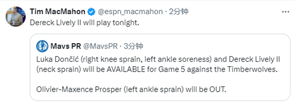 178直播讯 北京时间5月31日,东契奇(右膝扭伤和左脚踝酸痛)继续带伤出战;独行侠迎来晋级总决赛的一大利好,球队中锋莱夫利确定复出,驰援东契奇和欧文冲击总决赛。