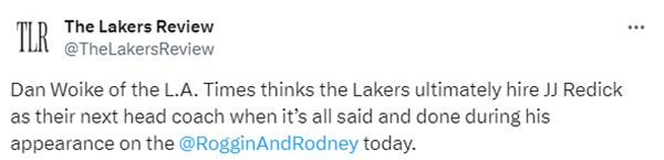 178直播讯 北京时间6月1日,湖人新帅已经没悬念了吗?据湖人记者Dan Woike报道,湖人最终将聘请JJ-雷迪克担任球队的下一任主教练。