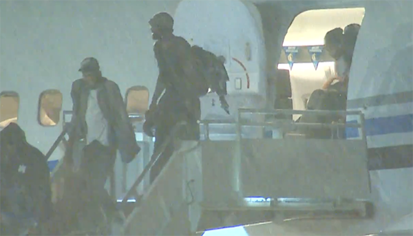 独行侠全员都冒着大雨下飞机,东契奇戴着西部冠军帽并且抱着西决MVP奖杯,欧文等人也戴着帽子,51岁的基德缓慢走下飞机,他好像抱着西部冠军奖杯;独行侠将帅全都淋着雨,估计全都被淋湿了,之后他们先后开车回家,并且在出口处向欢迎他们回家的工作人员打招呼。