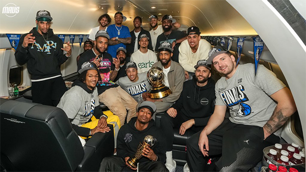 值得一提的是,独行侠全队还在机舱内合影留念——东契奇把西决MVP奖杯让队友抱着,自己单手抄兜坐在前排边上,小琼斯抱着西部冠军奖杯,莱夫利等人满脸笑容,华盛顿一脸霸气,欧文十分低调,坐在角落里,仅仅只露出一个头。