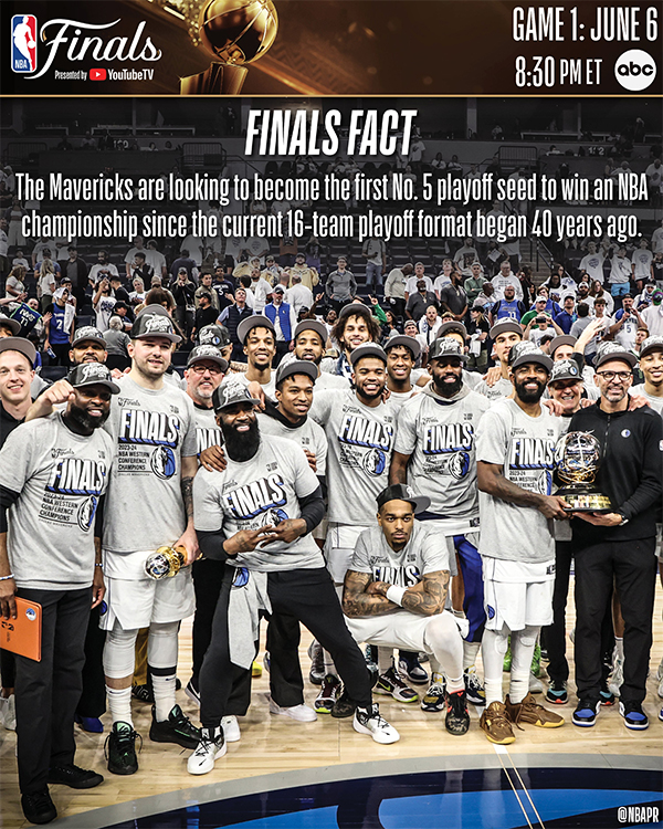 独行侠是NBA历史上第二支以5号种子进入总决的球队,历史首支是2019-20赛季的热火;若独行侠夺冠的话,他们将成为自1984年,联盟季后赛改制为16支球队参赛以来,首支夺冠的五号种子球队。