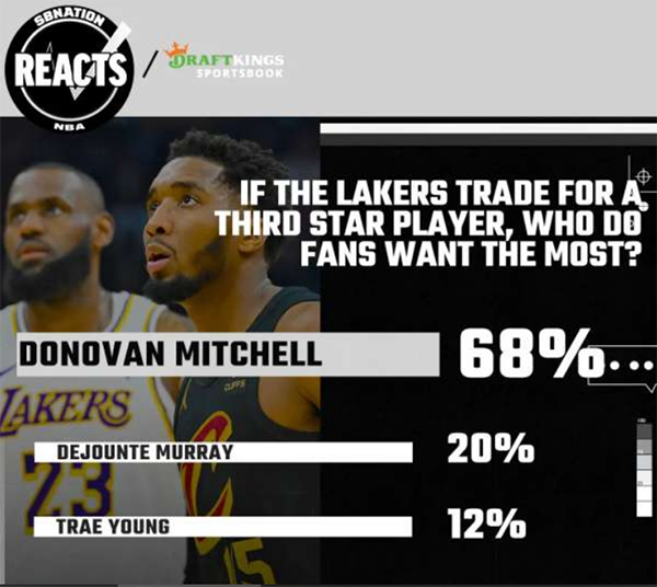 178直播讯 北京时间6月3日/讯近日美媒SilverScreenandRoll面向湖人球迷进行了一项休赛期前瞻调查,如果湖人交易得到队内第三位球星,湖人球迷希望那个人是谁?多诺万-米切尔68%,德章泰-穆雷20%和特雷-杨12%。