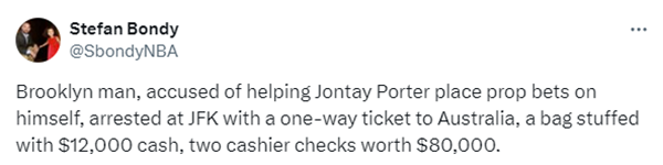 据NBA记者Stefan Bondy报道,波特赌球的一位同谋者已经在肯尼迪机场被逮捕,该男子名叫Long Phi Pham,又名Bruce,在周二试图使用单程机票从肯尼迪国际机场飞往澳大利亚班时被捕,当时他带着1.2万美元现金和8万美元的银行存款。