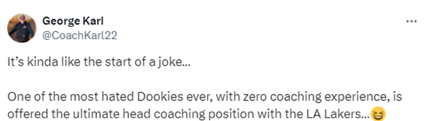对于湖人选帅锁定雷迪克,前NBA千胜教头乔治-卡尔发推写道:这就像一个笑话的开头(笑话首字母与雷迪克名字首字母一样)。史上最令人讨厌的杜克球员之一,没有任何执教经验,却成为了湖人队的主教练。