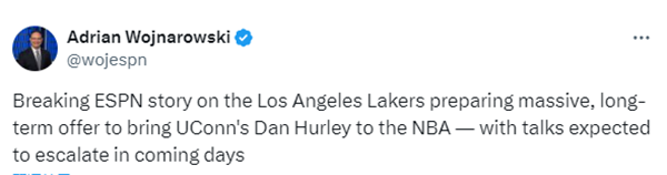据NBA记者John Fanta报道,丹-赫尔利今天早上在康涅狄格大学与球员们见面,并告知他们自己一直在与湖人交流。