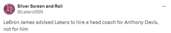据悉,詹姆斯建议湖人为浓眉而聘请新的主教练,而不是为了他。据湖人记者Dave McMenamin报道,一位知情人士透露,詹姆斯并未与湖人就丹-赫尔利或JJ-雷迪克相关的选帅事宜进行任何交流;詹姆斯通过其代表明确表示,湖人应做对球队最有利的事情,并且他理解和尊重湖人需要决定一位将在他职业生涯结束后继续带队的教练。