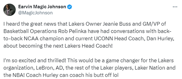 对于湖人追求赫尔利担任主帅,湖人名宿魔术师发声:我听到一个好消息,湖人队老板珍妮-巴斯和篮球运营总经理兼副总裁佩林卡已经与 NCAA两届冠军、现任康涅狄格大学主教练丹·赫尔利进行了交谈,商讨成为下一任湖人队主教练的事宜! 我太激动了!这会改变湖人组织、勒布朗、安东尼-戴维斯、湖人其他球员、湖人国度和NBA 的格局!赫尔利教练可以拼命执教(NBA)了。