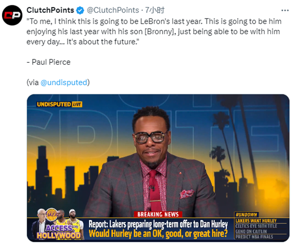 对于詹姆斯可能父子同台,凯尔特人名宿皮尔斯表示:我认为这将是詹姆斯生涯最后一个赛季。他将和他的儿子布朗尼享受自己生涯最后一个赛季,他能够和儿子每天都在一起。这关乎未来。
