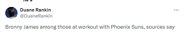据太阳跟队记者Duane Rankin报道,本周四,布朗尼-詹姆斯已经在太阳的训练设施进行了一次训练,布朗尼在太阳的训练中表现出色,球队让球员们进行了一系列以投篮为重点的训练;他并不是唯一试训的球员,一些选秀热门也参加了试训,维拉诺瓦后卫马克-阿姆斯特朗和西弗吉尼亚州后卫拉奎恩-巴特尔表现出色。