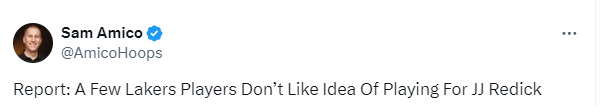178直播讯 北京时间6月9日,湖人选帅备受关注,据NBA记者John Fanta报道,湖人队有几名球员不喜欢为JJ-雷迪克效力;名嘴帕金斯表示选赫尔利是为了浓眉和湖人的未来,并不是为了詹姆斯。