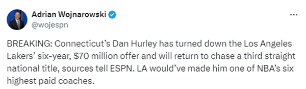 178直播讯 据名记woj报道丹-赫尔利拒绝了湖人6年7000万美元合同报价,选择留守康涅狄格大学,冲击NCAA三连冠,如果接受湖人的合同,赫尔利本会成为NBA历史最贵教练的前六名。